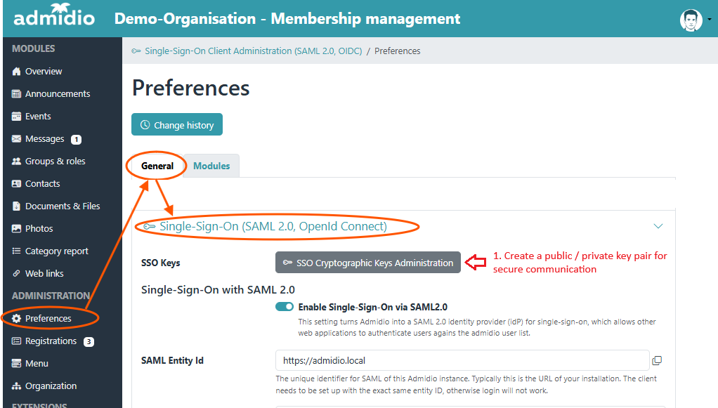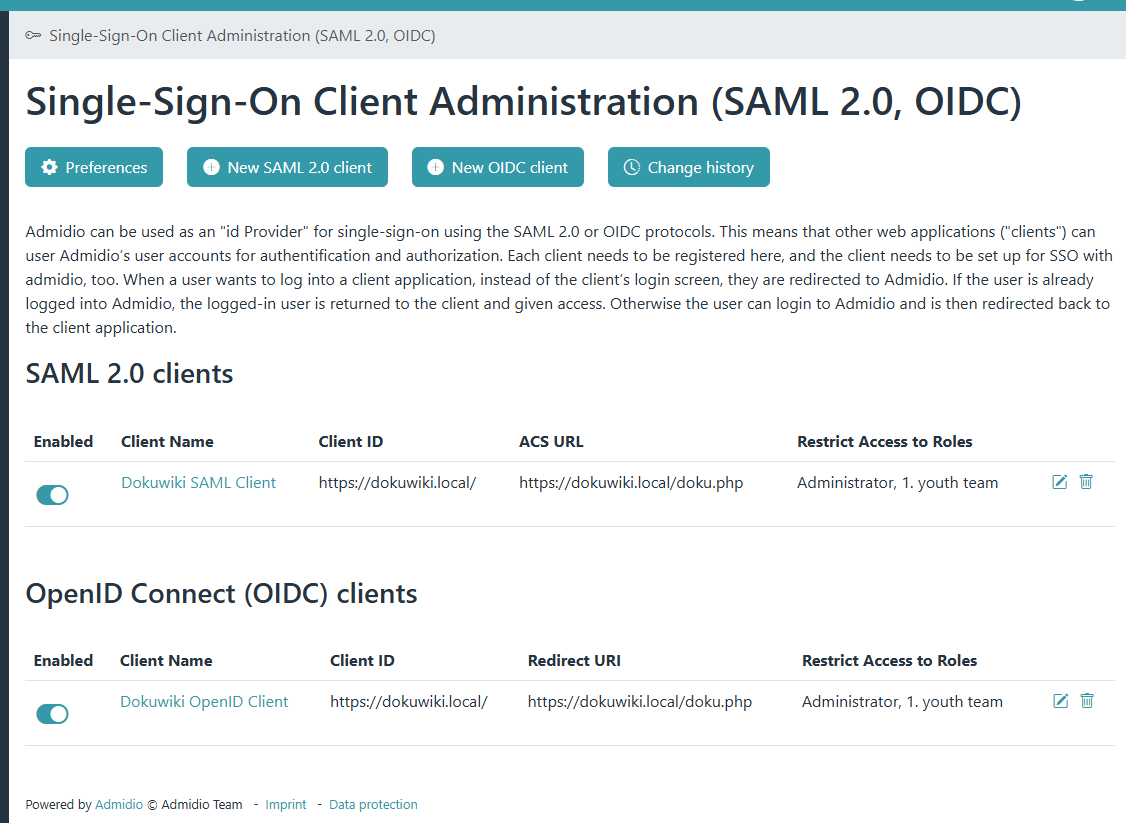 Admidio's general SSO configuration is done in the preferences (Tab “Modules”, section “Single-Sign-On (SAML 2.0, OpenId Connect)”).