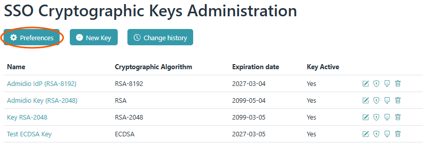 • To manage keys, use the “SSO cryptographic Keys Administration” button to switch to the key administration page.