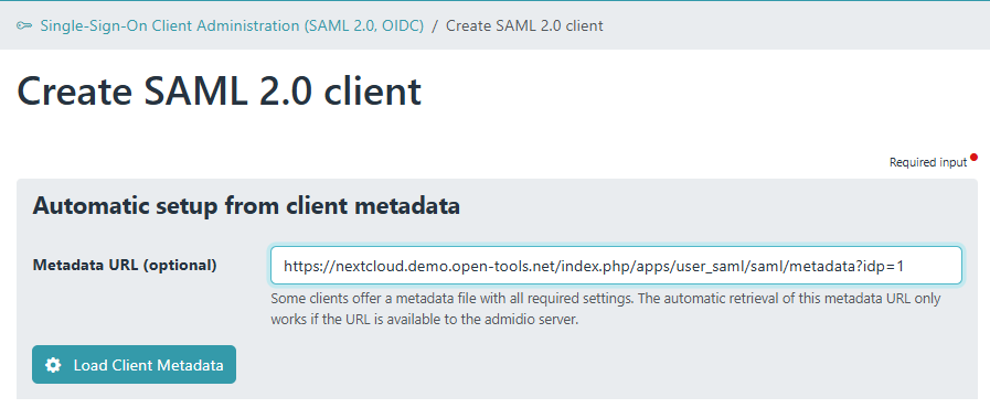 2. Ideally, the client (“Service Provider”) will provide a link to xml metadata. Paste this URL and let Admidio automatically load the configuration.