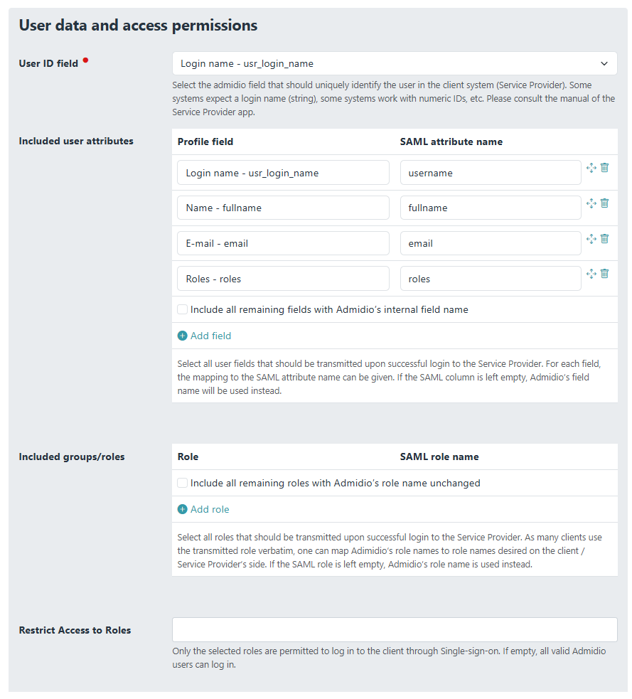 • Which roles / group memberships are sent to the client on successful login. The data fields and groups can be mapped to different names, if the client cannot handle Admidio's fields and role names. On particular case is the admin role, where many clients use a role named “admin” to grant admin access to a user logged in via SAML.