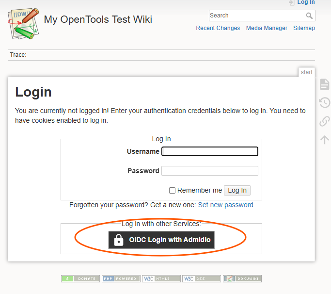 Admidio and DokuWiki should now be set up to use Admidio for logging in to Dokuwiki. If you log out of DokuWiki and try to log in again, you will be shown the Admidio login screen and then redirected back to Dokuwiki.