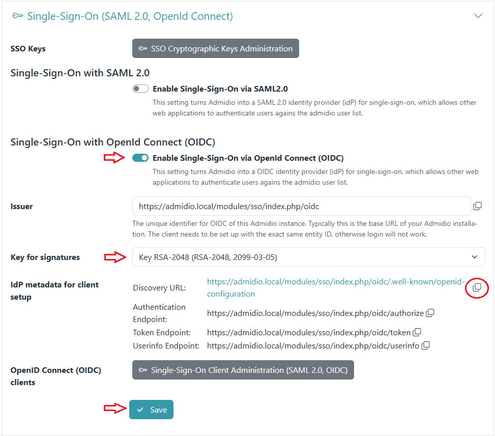 - Configure it either with Admidio's discovery URL (if supported), or enter the EntityID and the URL endpoints for authentication, token and userinfo.