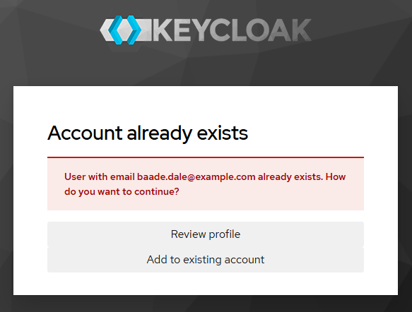 If the account already exists (e.g. because you are in a hybrid setup with multiple identity providers, e.g. SAML and OpenID through Admidio), then Keycloak will ask for permission to add the SAML login to the existing account. The user must additionally log in to the existing account to prevent security issues: