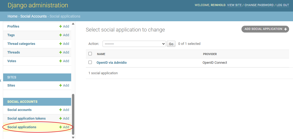 - Go to the Accounts section and select “Social Apps”, where you can add a new OpenID provider through Admidio (see below where the individual settings can be copied from):