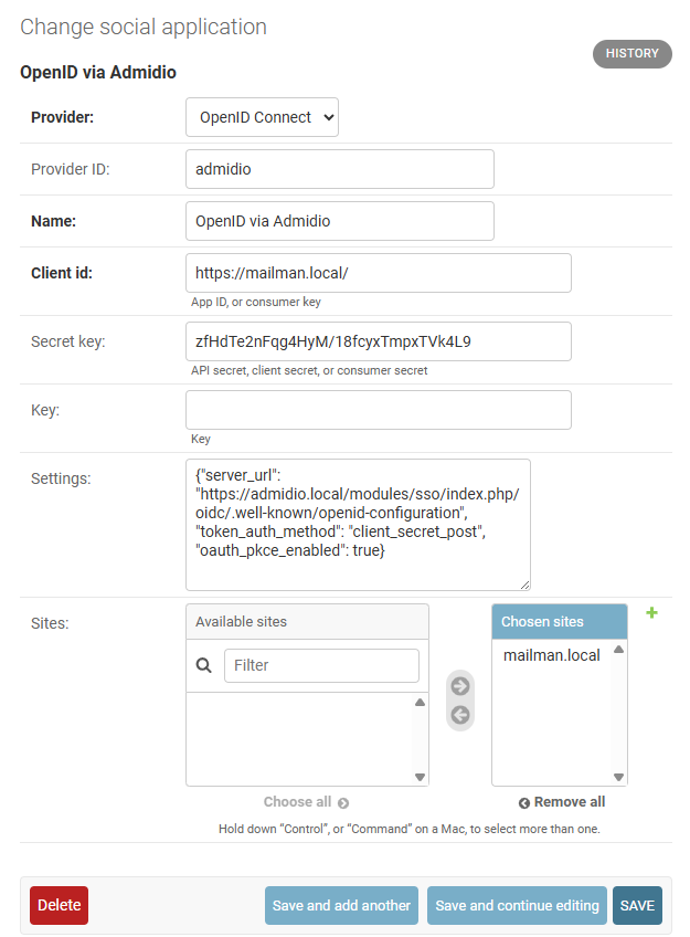 - To set up the OpenID provider with the admin GUI, go to the Django admin backend