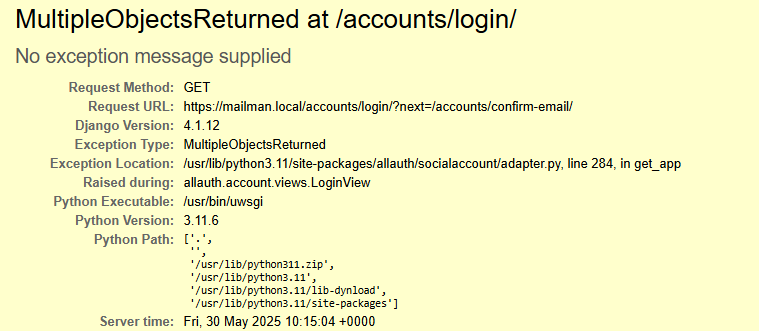 - Mailman currently only supports one OpenID provider at the same time. If you set up two or more providers, an error message about duplicate objects will be triggered ('MultipleObjectsReturned at /accounts/login/'). You need to remove (or comment out in