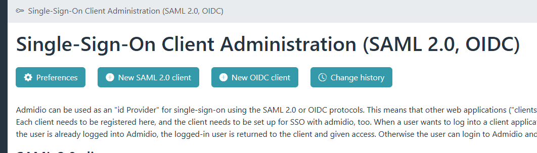Return to Admidio's SSO preferences page, go to the “Single-Sign-On Client Administration” (the button right below the endpoint URLs and above the “Save” button), and create a new client.