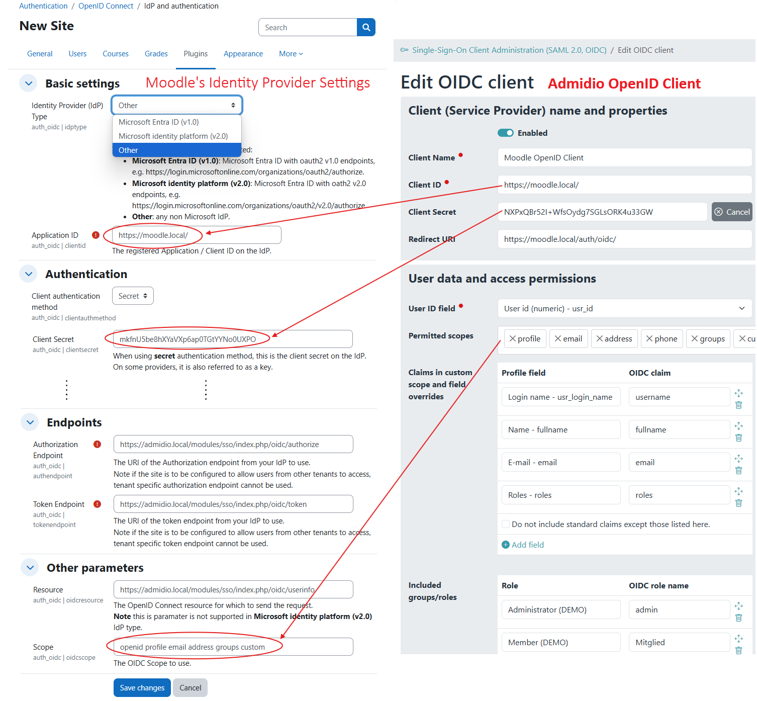 - Configure it with Admidio's endpoint URLs for authentication, token and userinfo, and enter the EntityID. Auto-discover is currently not supported by the Moodle plugin.