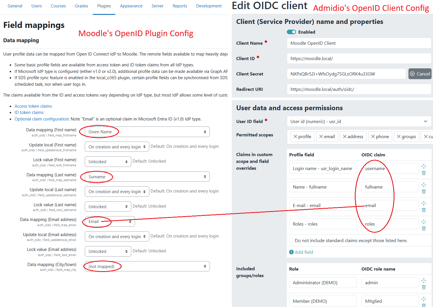 - In Admidio, map the user ID, username, email and fullname to fields that are included in the OpenID login response (so-called “claims”) and enter the corresponding claim names in Moodle.