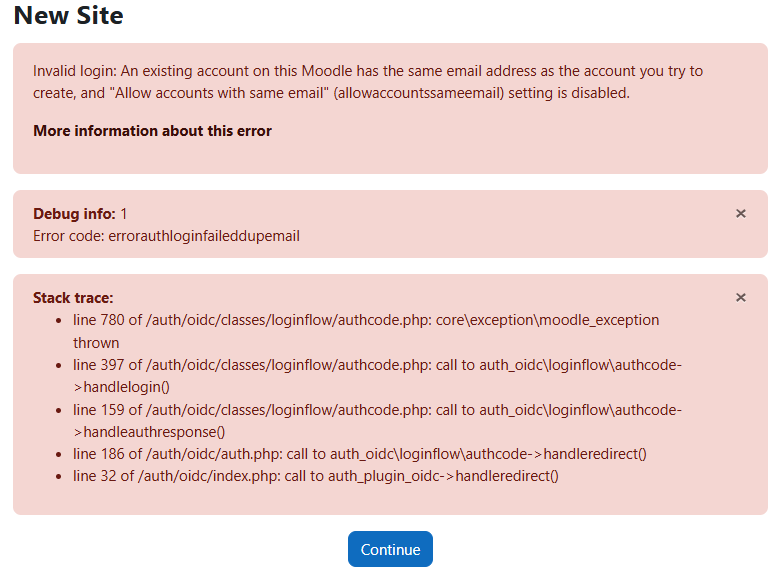 - If you have user accounts from different backends (e.g. local accounts, OpenID Connect login, SAML login) and an account for a user was already created, Moodle tries to match accounts by username (the field selected in the plugin config). However, if the other account has the same email address, but a different user ID through the SAML or local backend, Moodle will try to create a new account with the SAML user ID, but fails since another account with the same email already exists.