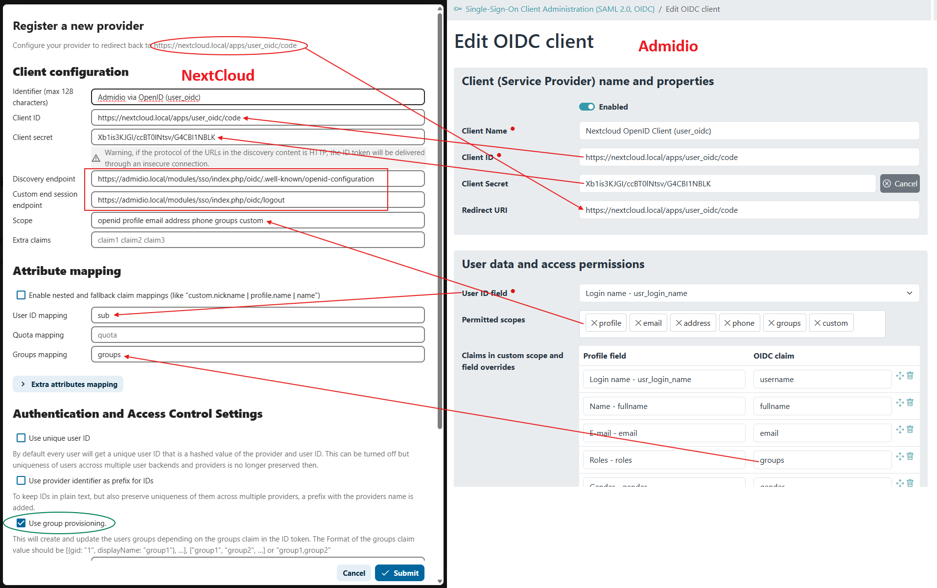 - Nextcloud's oidc_login plugin supports groups. It will use the groups provided by Admidio verbatim, so if you need particular group names, the group names mapping can be done in Admidios OpenID client configuration. Nextcloud can create new groups automatically, but that can be turned off, too.