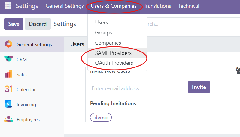 - You can now switch to the OAuth / OpenID Providers list either with the “OAuth Providers” link next to the checkbox, or via the menu item “Users & Companies” → “OAuth Providers”