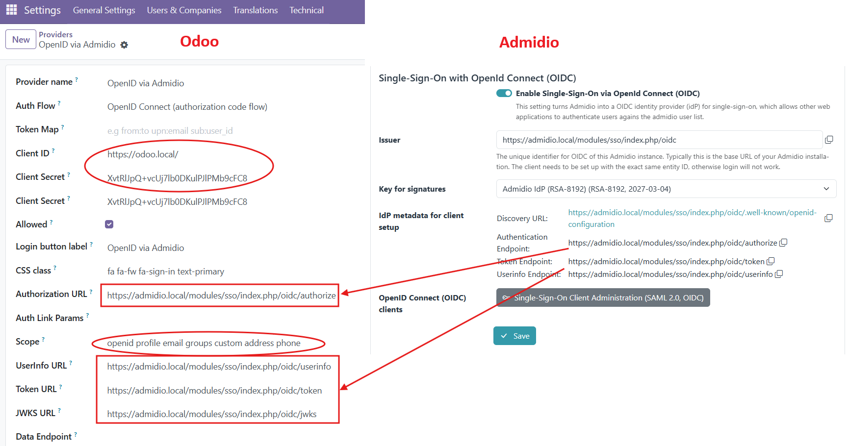 - Go to Admidio's Single-Sign-On Preferences and copy the endpoint URLs for OpenID (Authentication, token and userinfo endpoints). They should be pasted into Odoo's Client configuration as “Authorization URL”, “UserInfo URL” and “Token URL”. The “JWKS URL” (which provides access to the cryptographic key) is the same URL as the other endpoints, only with “jwks” instead of “authorize”, “token” and “userinfo.
