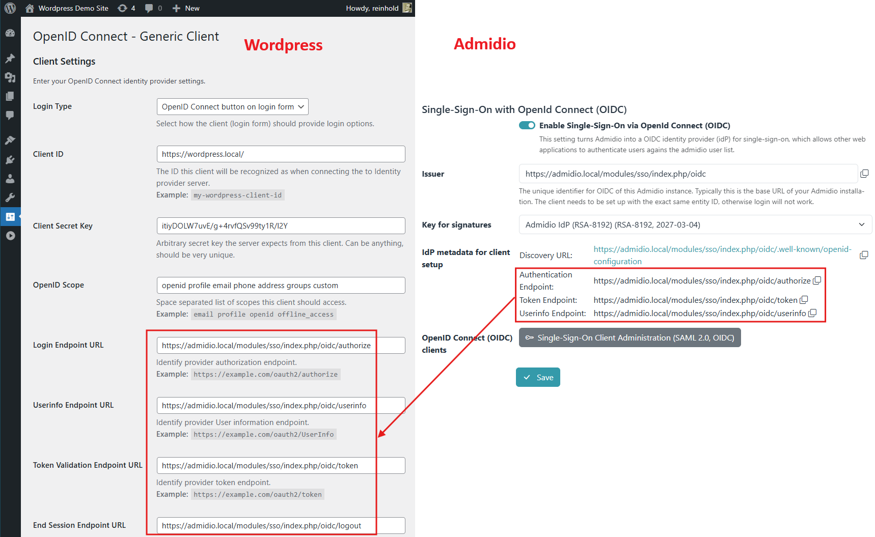 • Configure it either with Admidio's endpoint URLs for authentication, token and userinfo, and enter the EntityID.