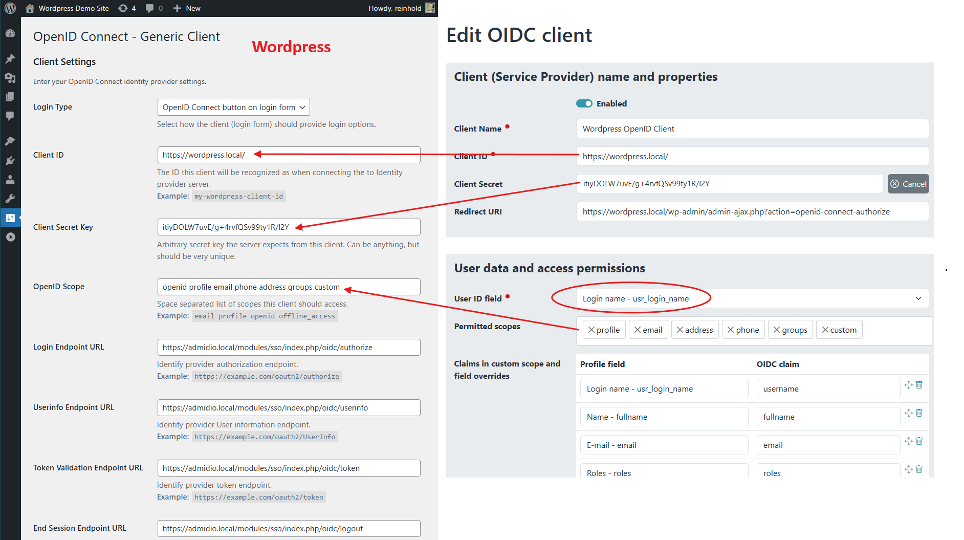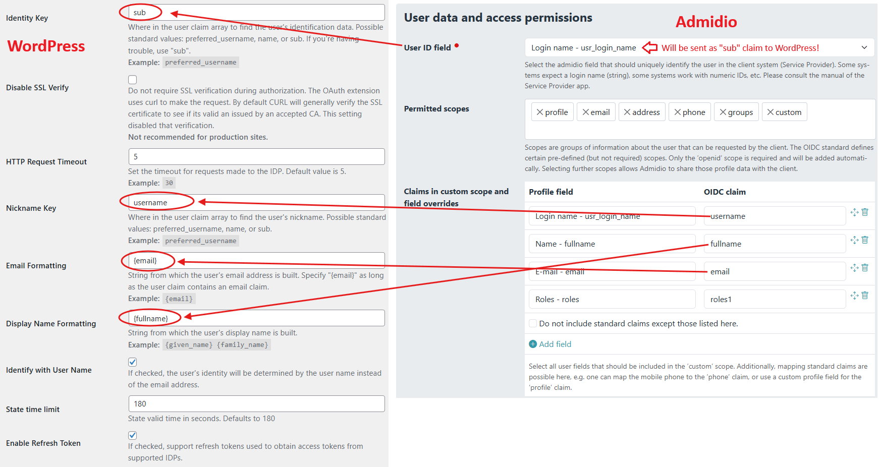 • In Admidio, map the user ID, username, email and fullname to fields that are included in the OpenID login response (so-called “claims”) and enter the corresponding claim names in Wordpress. If the field names are not alligned, login will not be possible, but the error message will be quite generic without helpful hints.