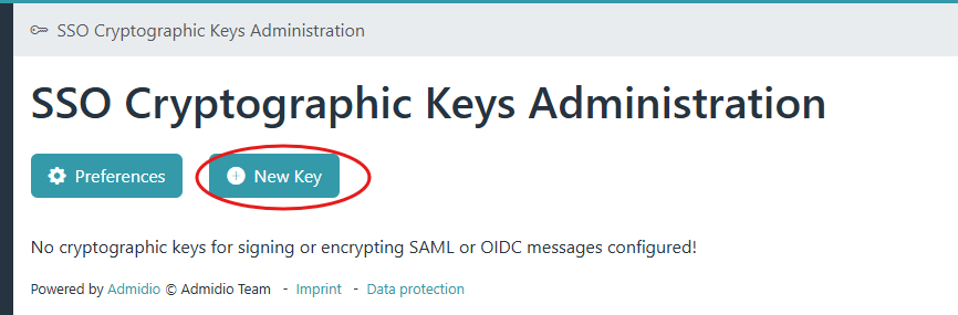 - The first thing to do is to create a cryptographic key (typically an RSA key with 2048 bit). For this, use the “SSO cryptographic Keys Administration” button to switch to the key administration page.