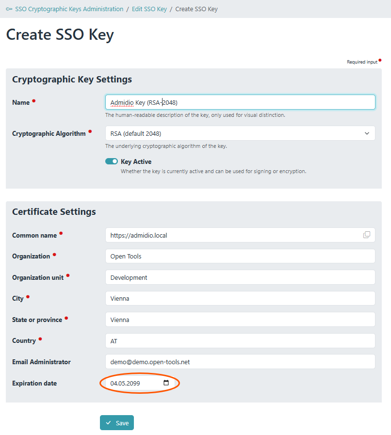 At the “SSO Cryptographic Keys Administration” page, create a new key (typically RSA with 2048 bits). - Also enter the URL of the Admidio installation as “Common Name”. The other required fields (Organisation, OU, city, etc.) must be filled, but their value is not relevant. Make sure that the expiration date is long enough! By default, an expiration of two years is suggested.