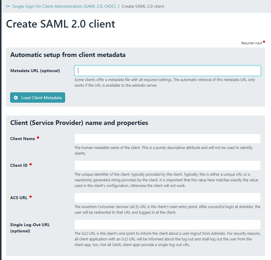 - In Admidio, create a new SAML client. If the SP provides a metadata URL, paste it and let Admidio automatically load the configuration from the SP. One can also manually paste these settings.