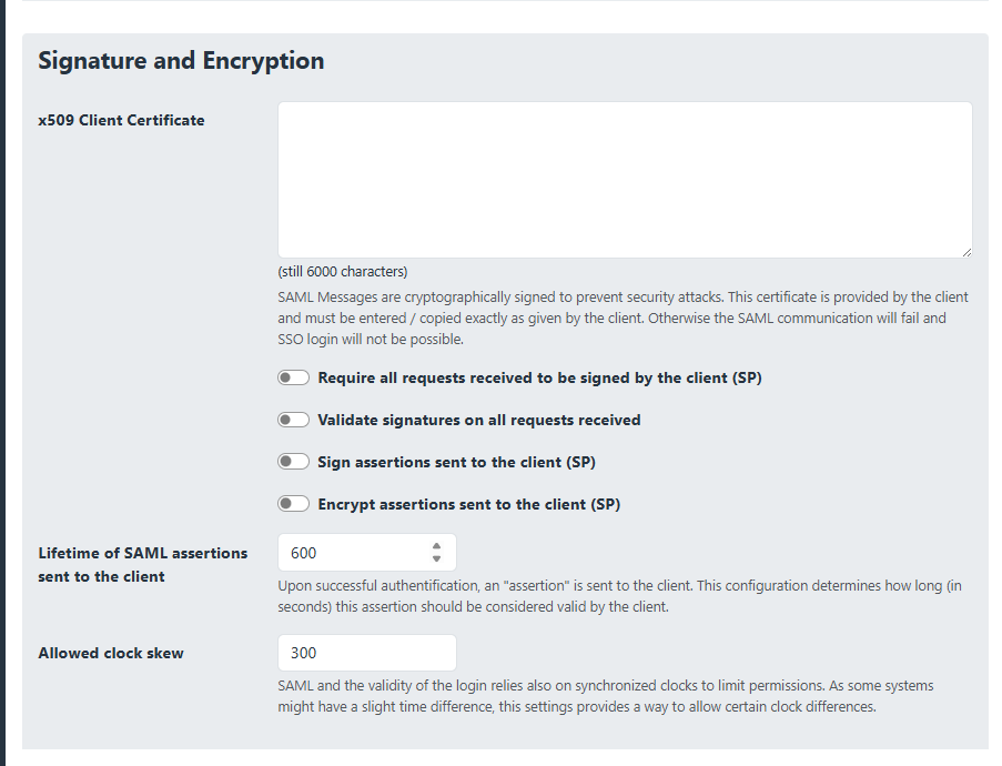 In addition each client typically has settings to require sent or received SAML messages to be signed and/or encrypted to ensure a secure login process. The details depend on the capabilities of the client. Some clients do not support encryption, other require all SAML messages to be signed (for good reason!).