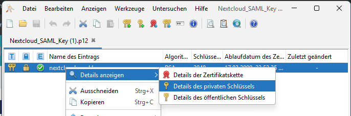 After downloading the .p12 file, Applications like KeyStore Explorer can be used to read the private key and copy the private key and the certificate in PEM format to the clipboard and paste it into Nextcloud's SAML configuration.