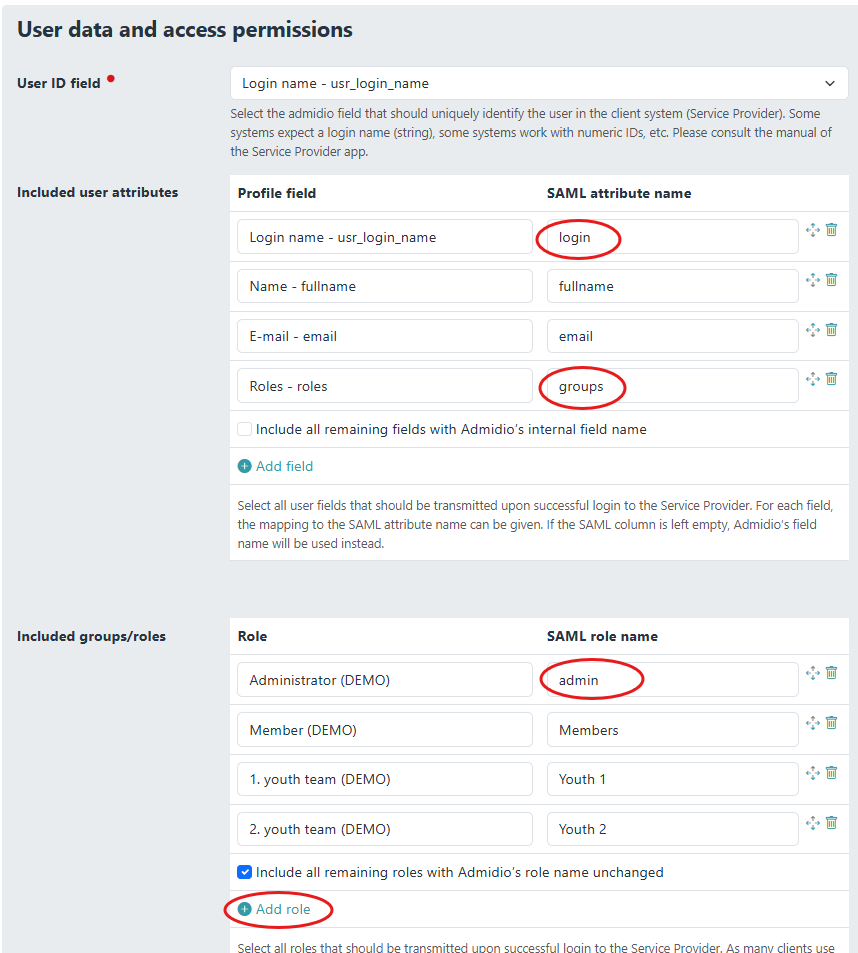 In addition to the Entity ID and URLs to connect SP and IdP and the certificate, which are configured automatically, one also needs to define the attribute and role mapping. The username is the most relevant. To use Admidio's group memberships as Dokuwiki groups, make sure to include the “Roles” field and provide the correct field name in Dokuwiki.