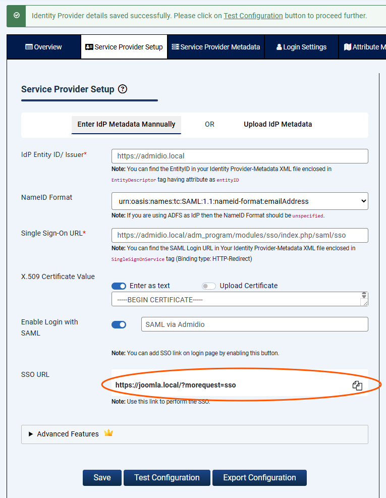• Configure it either with Admidio's link to the metadata file, or enter the EntityID, the Single-Sign-On Endpoint, the SLO Endpoint and the public certificate manually (Admidio provides a simple table to copy these values from).