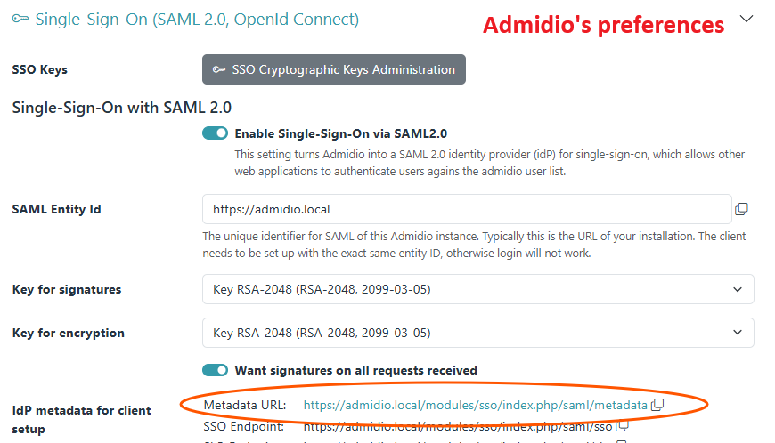 Basically, one (1) needs to create a cryptographic key to sign message and choose a unique EntityID. The page preferences https://admidio.local/adm_program/modules/preferences.php?panel=sso also provides the link to the metadata xml, and the individual settings in case a client does not support auto-configuration via metadata.