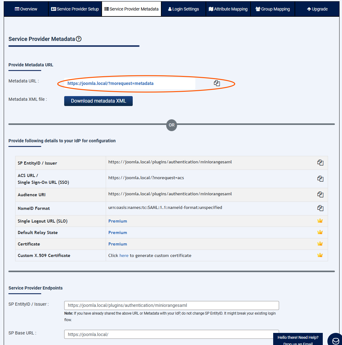 Once these basic SAML settings are done, set up the SP in Admidio. The required metadata URL from Joomla's plugin can be found in the “Service Provider Metadata” tab.