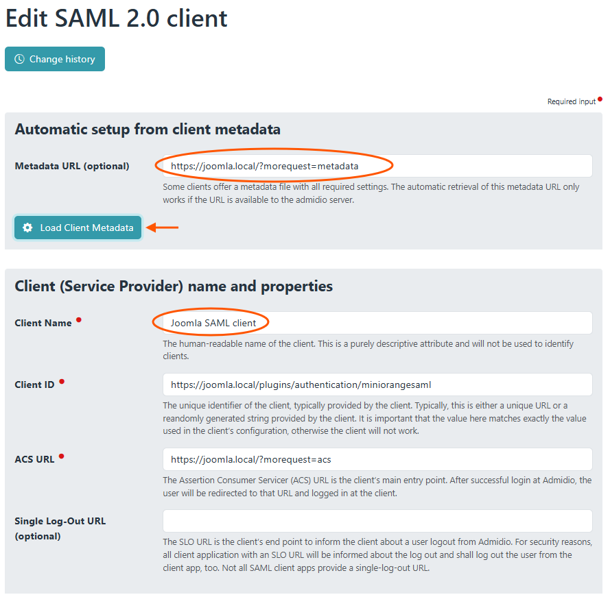 Paste the metadata URL copied from Joomla into the corresponding input field at the top and click “Load Client Metadata”. This should load all settings from Joomla and pre-fill the following fields correctly. Only the Client Name needs to be entered. Choose any name to clearly identify the client in the list of SAML clients. There is no functionality depending on the name.