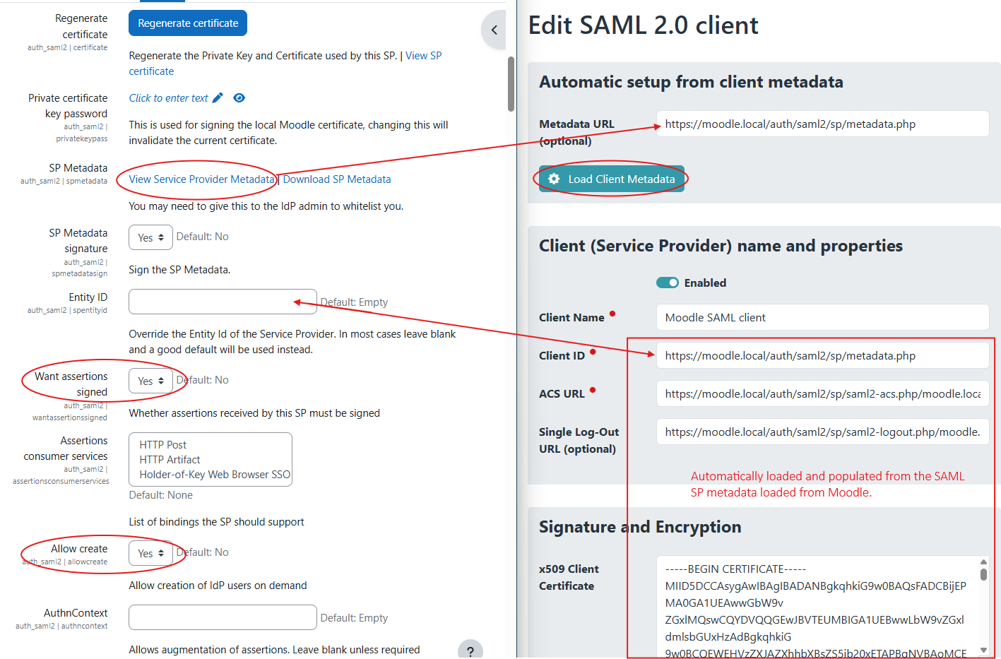 - If the Moodle config does not override the “Entity ID”, it will be the Metadata URL, which uniquely identifies the SAML client.