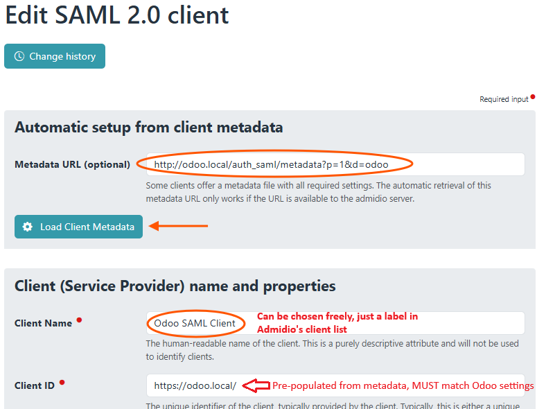 Paste the metadata URL copied from Odoo into the corresponding input field at the top and click “Load Client Metadata”. This should load all settings from Nextcloud and pre-fill the following fields correctly. Only the Client Name needs to be entered. Choose any name to clearly identify the client in the list of SAML clients. There is no functionality depending on the name.