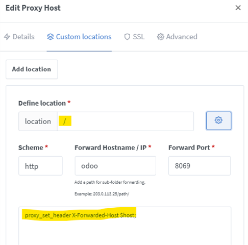 - Make sure the reverse proxy sends all proper proxy headers, including X-FORWARDED-HOST, which is used by odoo to detect a reverse proxy setup. Nginx Proxy Manager by default does not send this header. It is also not easily possible to add this header in the “Advanced” tab of the Proxy Host in NPM. Instead, one has to add Custom Location for “/” and set the X-Forwarded-Host header there via