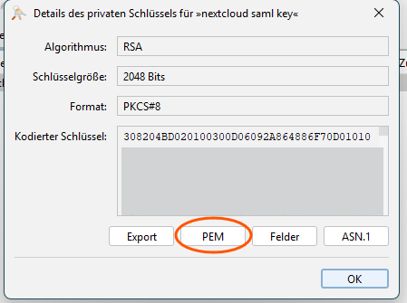 After downloading the .p12 file, Applications like KeyStore Explorer can be used to read the private key and copy the private key and the certificate in PEM format to the clipboard and paste it into Nextcloud's SAML configuration.