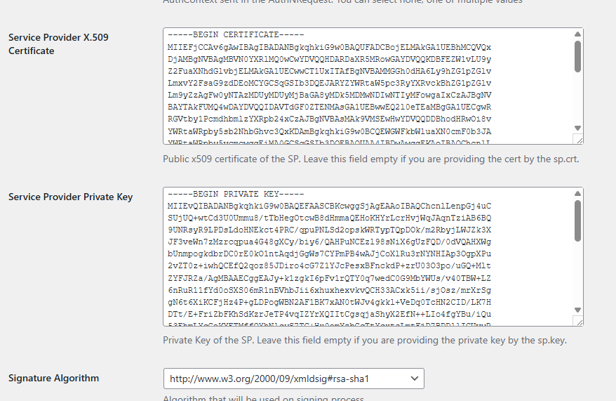 If encryption is desired for all SAML messages sent by Admidio to Wordpress, or if Wordpress should sign all its SAML requests, then Wordpress needs a private/public key pair to decrypt or sign messages. These need to be entered into the Wordpress SAML config in PEM format and can be generated by openssl's command line tools, by sites like https://www.samltool.com/self_signed_certs.php or in Admidio's key administration. Simply create a new Key for Wordpress (RSA 2048 bits). The certificate can be copied directly from the key's edit page, but the private key is not available in Admidio's GUI for security reason. Instead, it can be downloaded (secured with a password!) from the list of keys in Admidio: