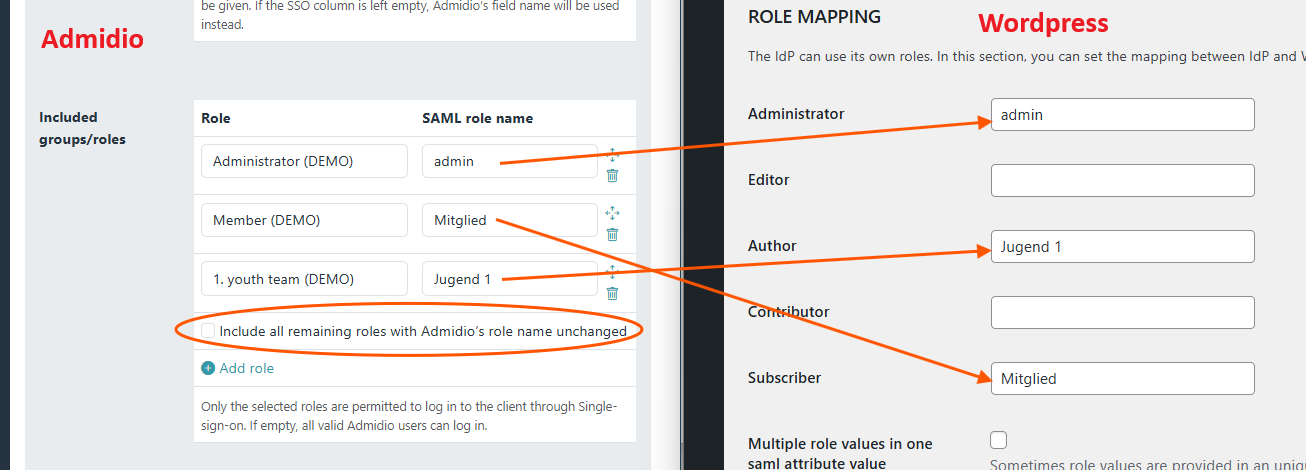 The Wordpress SAML configuration also provides attribute and role mapping sections. The attribute mapping defines how Admidio's user profile fields are translated to Wordpress profile fields (currently only first and last name and the login name). If you also want to use Admidio's group memberships / roles to determine access permissions in Wordpress, make sure sure include the roles in the mapping!