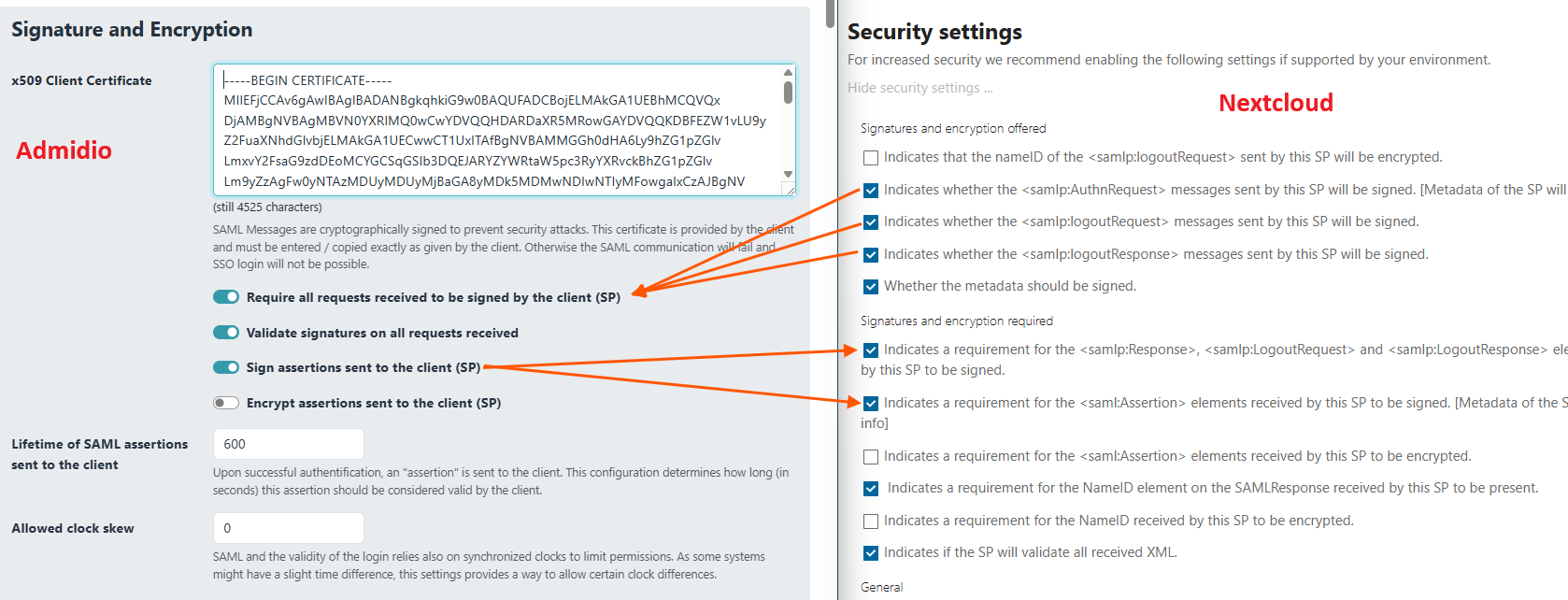 Once these basic SAML settings are done, I would recommend to set up the SP in Admidio, and do the remaining settings (transmitted fields and roles, as well as signing/encryption requirements) in parallel in Nextcloud and Admidio.