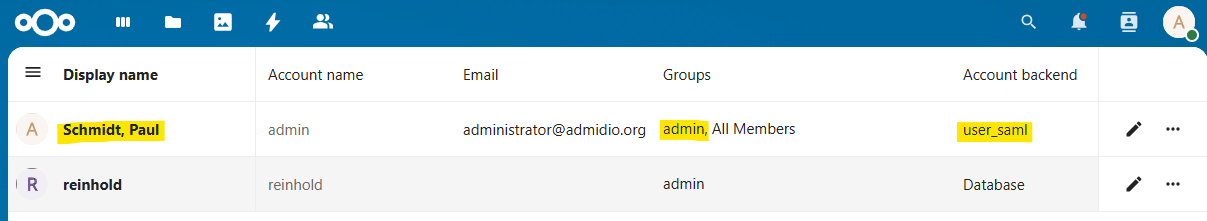 After choosing SAML login and loggin in with a user from Admidio, you should be logged in to Nextcloud.